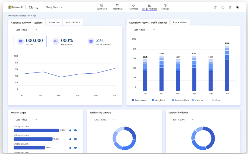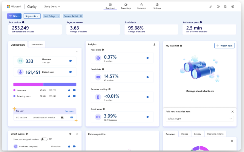 Microsoft Clarity는 마케터가 웹사이트 성과를 분석하고 최적화할 수 있도록 돕는 여러 강력한 기능을 제공합니다. 주요 기능들을 자세히 살펴보겠습니다.
