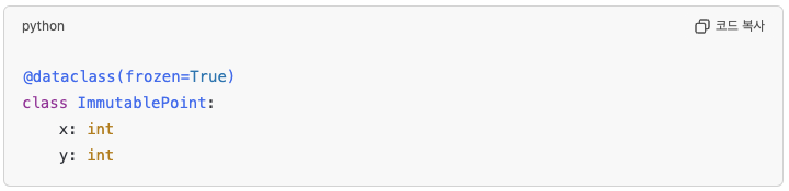 불변 클래스를 원한다면 frozen=True를 추가하면 돼요.