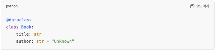 @dataclass 데코레이터만 붙이면 __init__, __repr__, 심지어 __eq__까지 자동으로 생성돼요.
