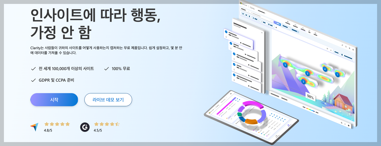 Clarity는 Google Analytics와 같은 복잡한 데이터 분석 도구를 보완하거나 대체하는 도구로도 활용할 수 있습니다. 특히, 비용이 발생하지 않으므로 예산이 제한된 팀에게 적합합니다.